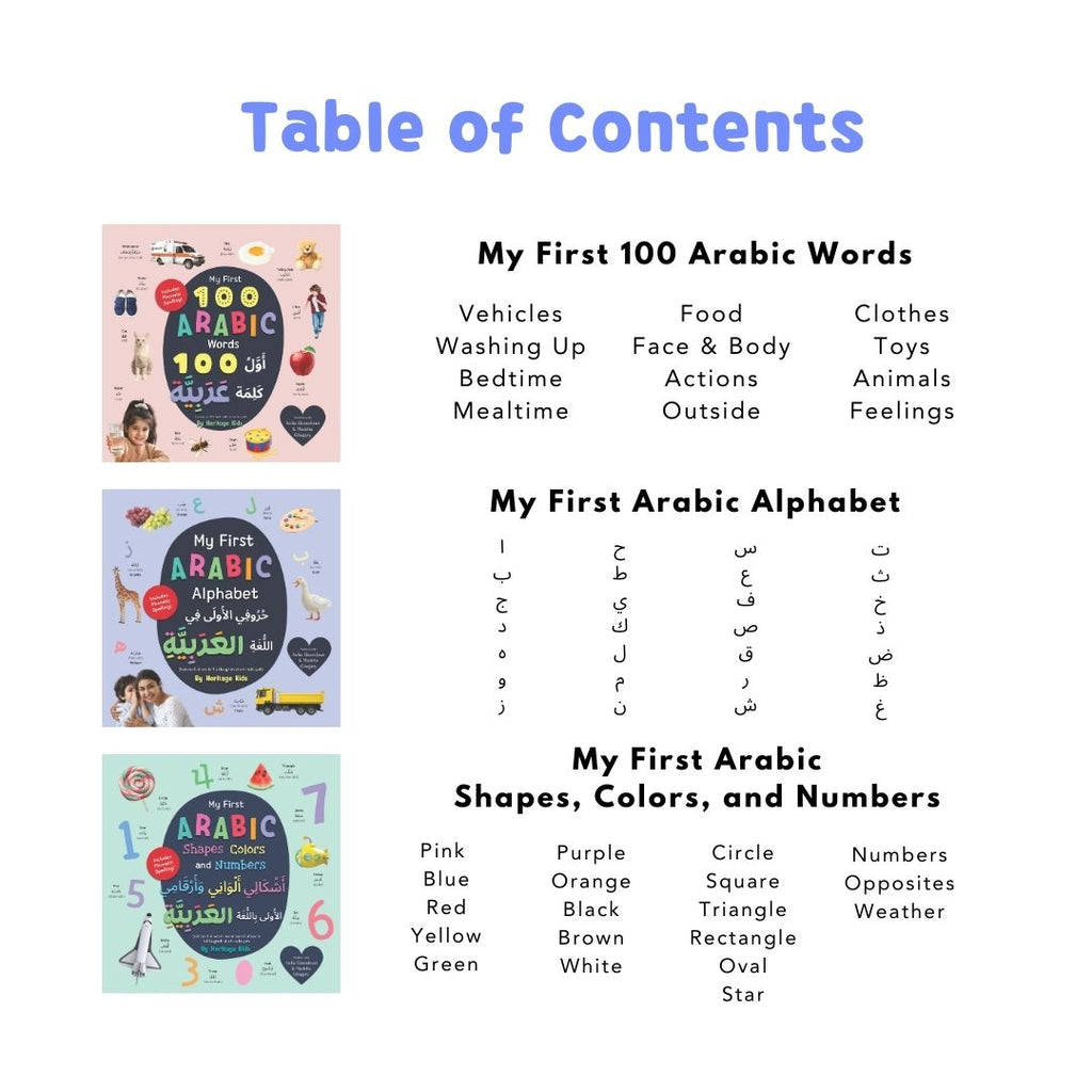Each book in the series is written in both English and Modern Standard Arabic. Every word includes phonetic spelling (romanization) to help with pronunciation, making it easier for parents to teach their children the Arabic language from an early age.