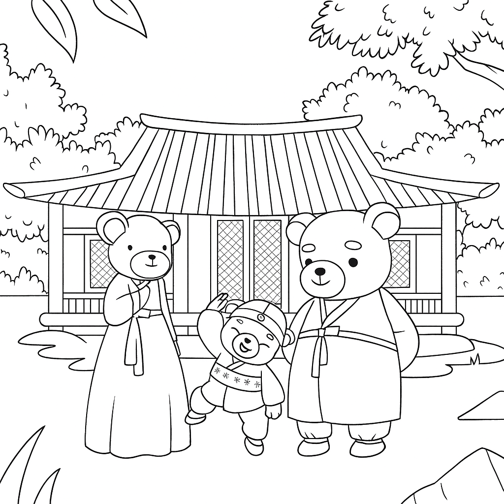 "Three Bears" coloring page to accompany the classic "Three Bears" Korean nursery rhyme in our bestselling "I Love to Sing in Korean: Nursery Rhymes" songbook.